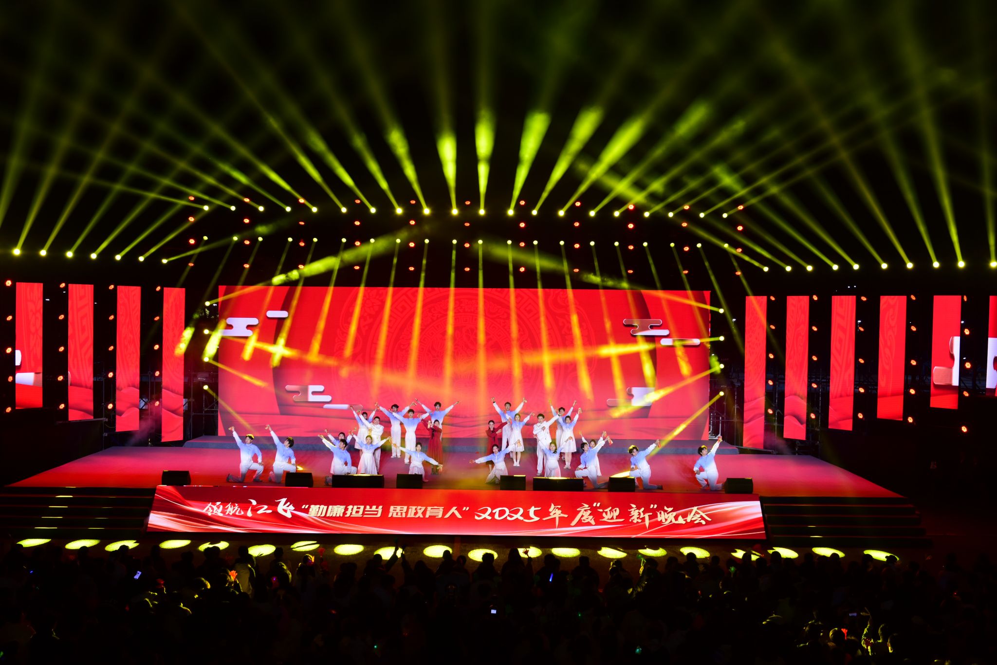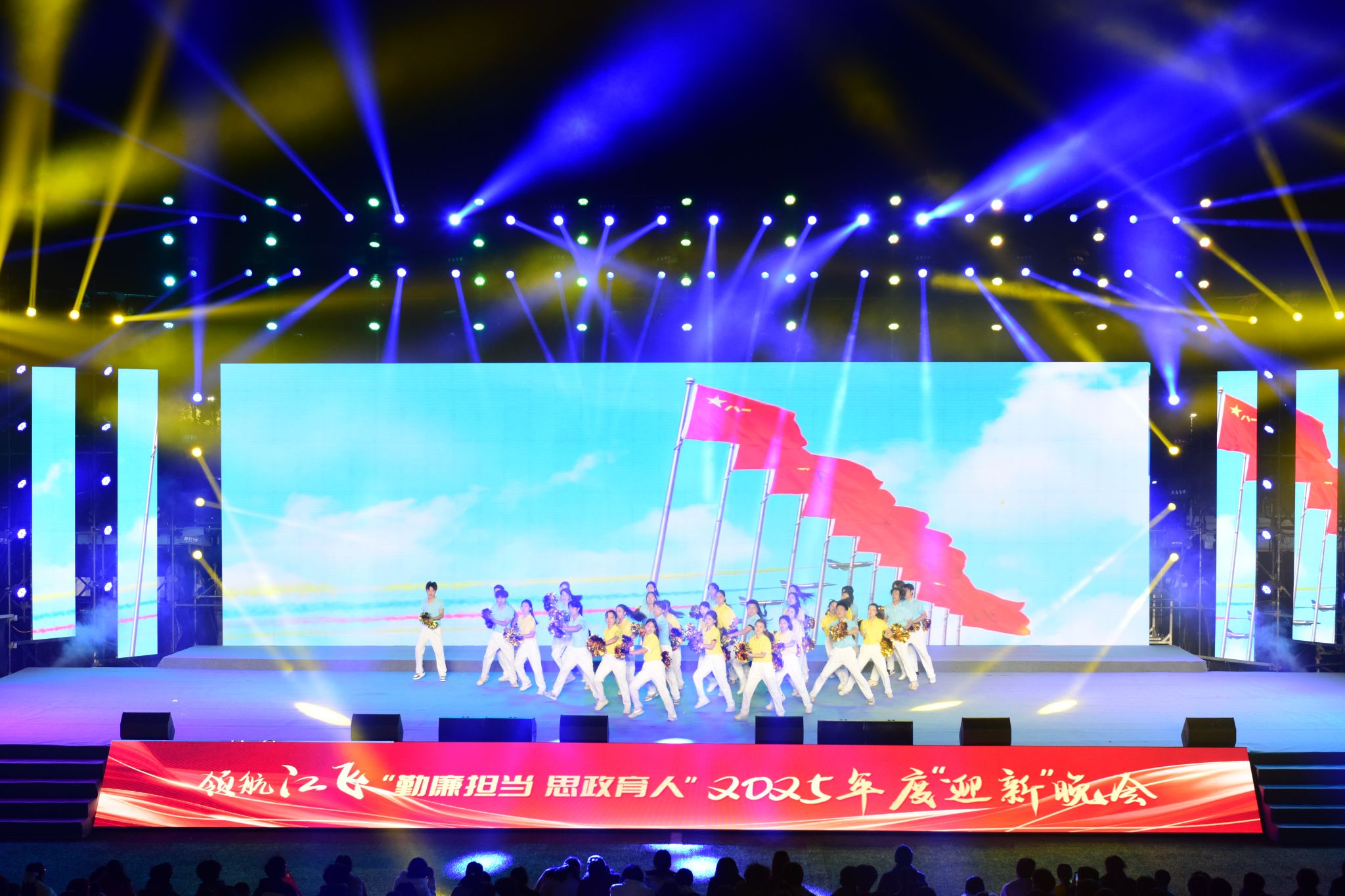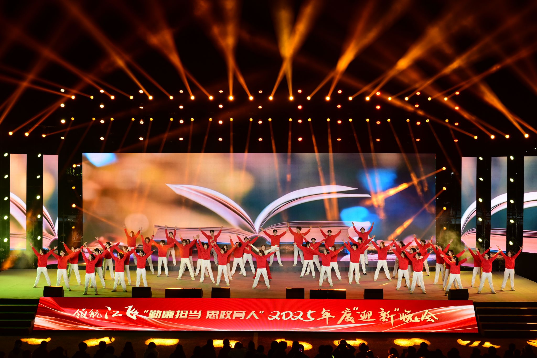 无人机表演率先点燃全场热情。晚会在激昂的《强军战歌》大合唱中正式开幕。诗朗诵《江飞正青春》抒发了对学校的深厚情感与美好祝愿,歌舞《人民的名义》诠释了立德树人的初心使命。《立足三尺讲台 践行教育家精神》以铮铮誓言表达了对教育事业的坚守。快板《廉政花开结硕果》以通俗活泼的形式传递勤廉理念,原创歌曲《爱如莫言》用旋律诉说着师恩情深。情景剧《站在历史的画廊回望你——况钟》贯通古今,激发奋进力量,舞蹈《桃李芬芳》《幸福江飞飞起来》则以优美舞姿展现艺术魅力。
