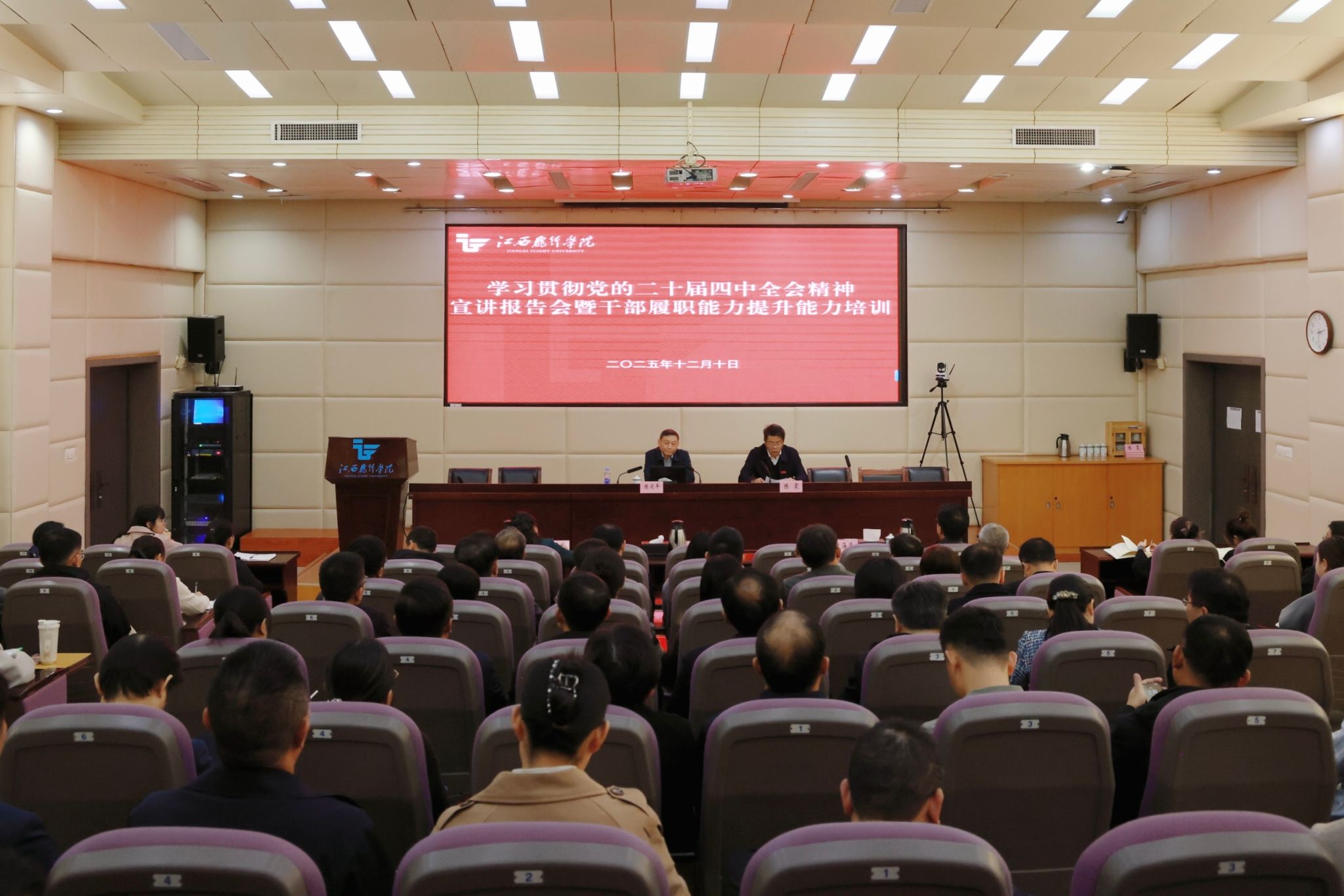 全体处级干部、科级干部、机关青年干部理论学习小组学员,共计130余人现场聆听。宣讲报告会通过学校官方微信视频号平台进行了同步直播。