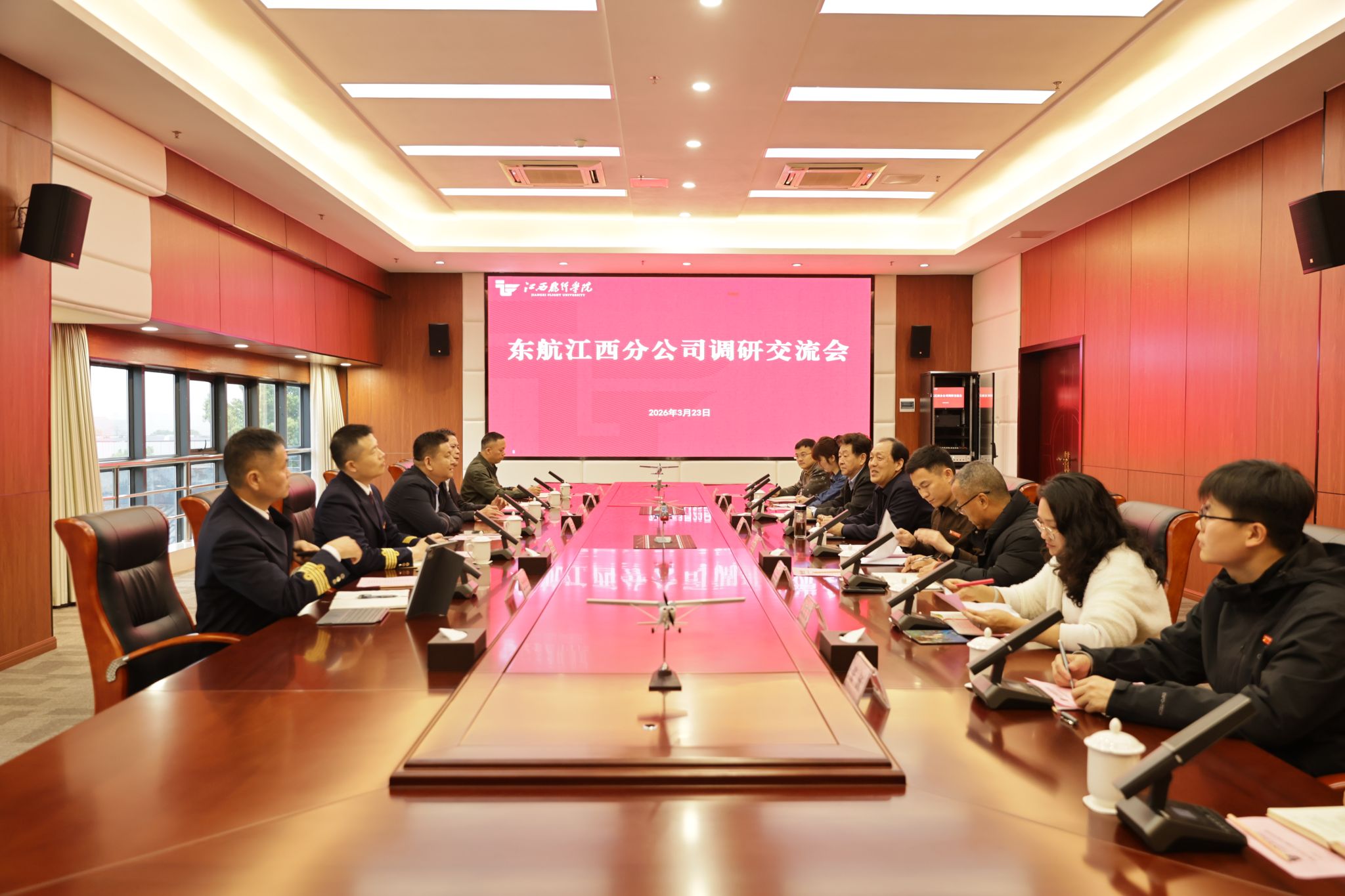双方围绕飞行人才培养体系构建、学员精细化管理、专业教学实践、民航人才需求标准等方面开展交流研讨,就深化校企协同育人、搭建贴合行业需求的育人平台达成共识。此次调研交流,进一步搭建了江西飞行学院与东航江西分公司的沟通桥梁,深化了双方在校企合作、人才共育方面的理解与共识。未来,双方将以此次交流为契机,持续加强沟通对接,不断拓展合作领域、完善合作机制,推动校企资源共享、优势互补,携手培养更多高素质、专业化的民航飞行人才,为江西乃至全国民航事业高质量发展注入强劲动力。