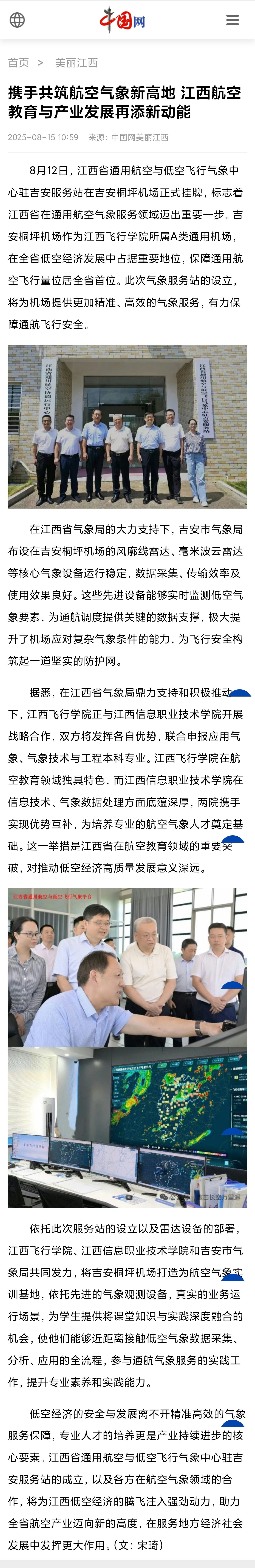 近日,中国网报道,携手共筑航空气象新高地 江西航空教育与产业发展再添新动能详情如下