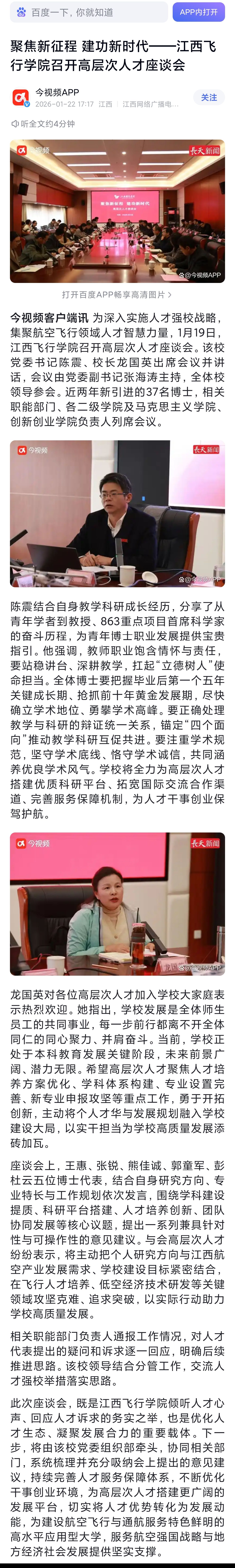近日,百度网报道,聚焦新征程 建功新时代——江西飞行学院召开高层次人才座谈会详情如下