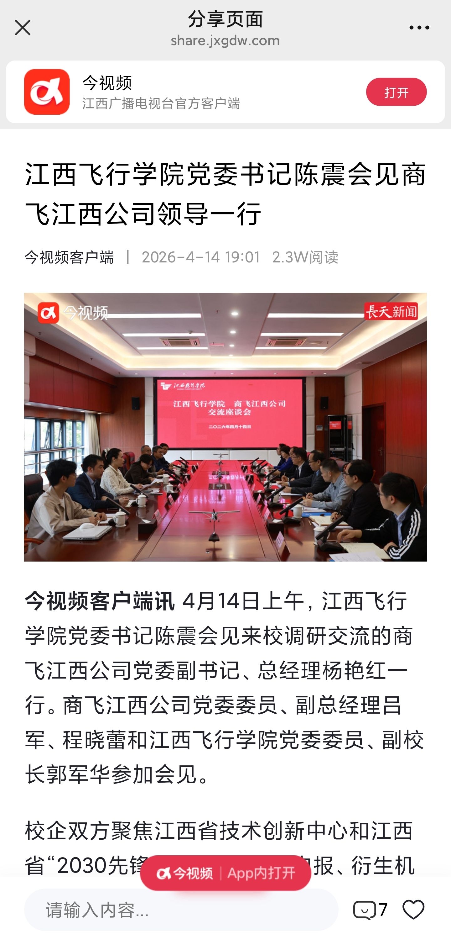 近日,今视频报道,江西飞行学院党委书记陈震会见商飞江西公司领导一行详情如下: