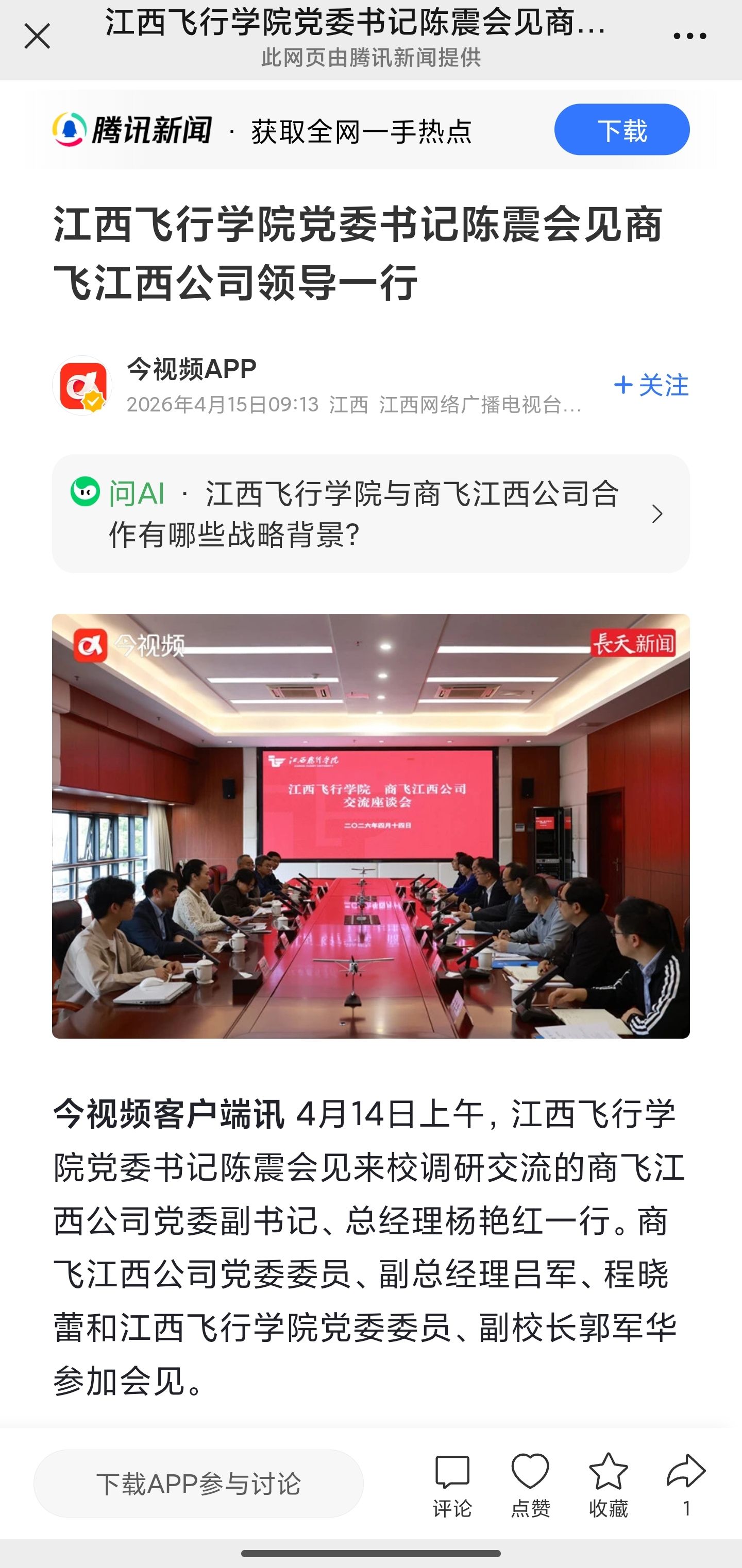 近日,腾讯新闻报道,江西飞行学院党委书记陈震会见商飞江西公司领导一行详情如下:
