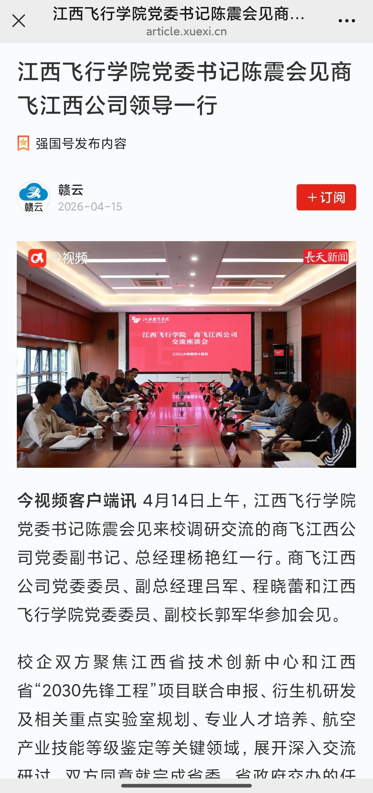 学习强国:江西飞行学院党委书记陈震会见商飞江西公司领导一行