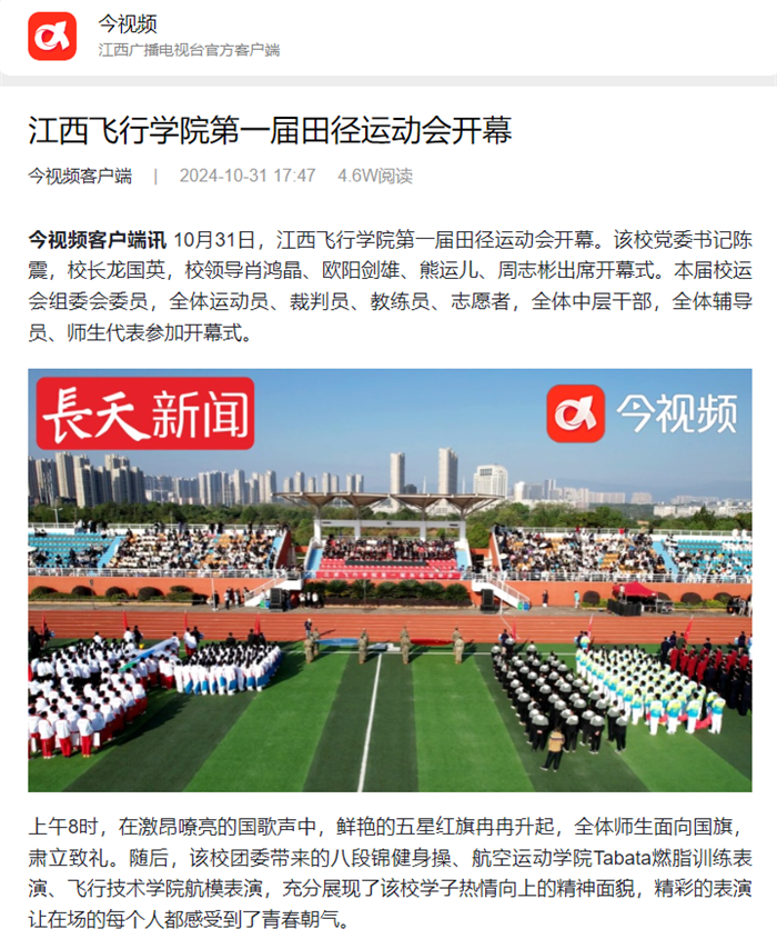 近日,今视频报道,江西飞行学院第一届田径运动会开幕,详情如下: