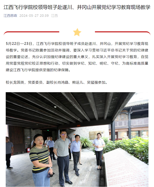 近日,多家媒体报道,江西飞行学院校领导班子赴遂川、井冈山开展党纪学习教育现场教学。详情如下: